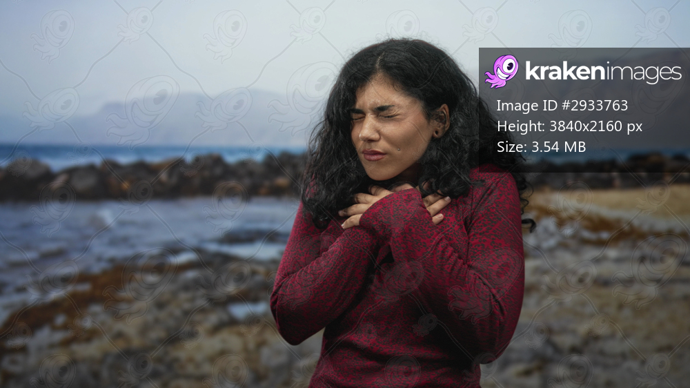 Young woman clutching hands to chest on beach with eyes closed, heartattack; distress vulnerability.
