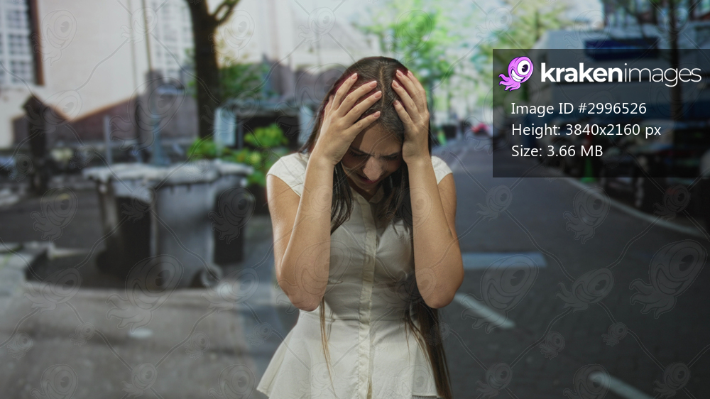 Young woman clutching head and raising hands on a city street, wearing white blouse and long hair, tense facial expression; frustration.