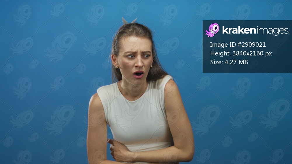 Young woman clutching her stomach and grimacing while seated in a blue studio wearing a white sleeveless top; nausea discomfort.