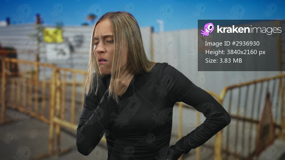 Young woman clutching throat and grimacing on street near metal barriers and shipping container; panic.