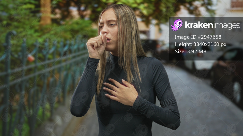 Young woman coughing into her fist with hand pressed to chest on a city street beside parked cars and an iron fence; distress.