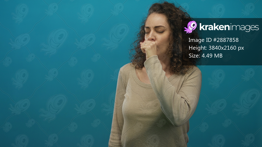Young woman coughing into her fist in studio with teal backdrop, curly hair and beige long sleeve top; sick recovery.
