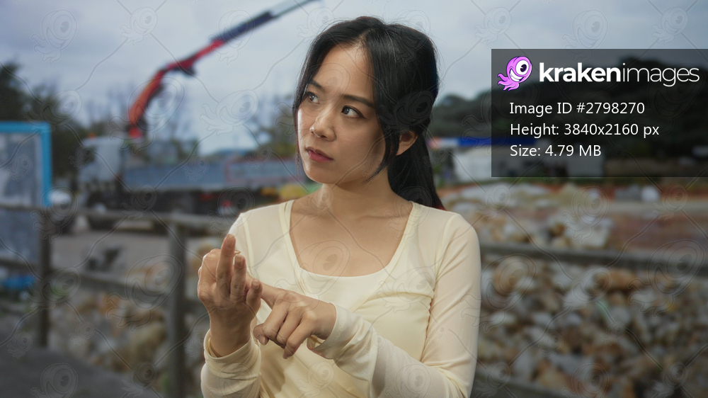 Young woman counting fingers at outdoor construction site with industrial machinery in background, reflecting focus and attention.
