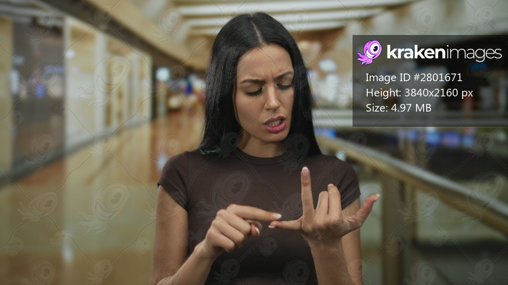 Young woman counting on fingers standing in a modern shopping mall with a thoughtful expression, encapsulating the bustling environment of retail and consumerism indoors. - Kraken Images