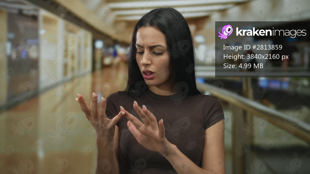 Young woman counting on fingers standing in a modern shopping mall with a thoughtful expression, encapsulating the bustling environment of retail and consumerism indoors. - Kraken Images