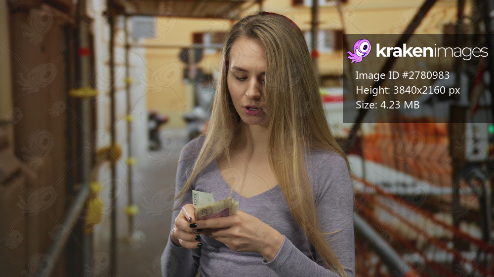 Young woman counts polish zloty banknotes at a construction site, showcasing financial planning outdoors with a thoughtful expression.