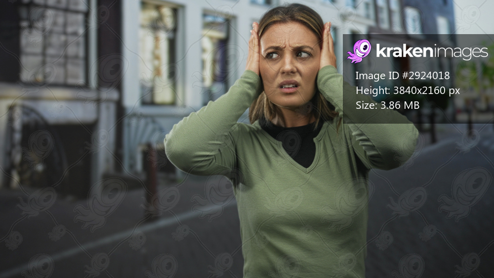 Young woman covering ears with hands on a city street, grimacing and squinting against loud noise; sensory overload pain.