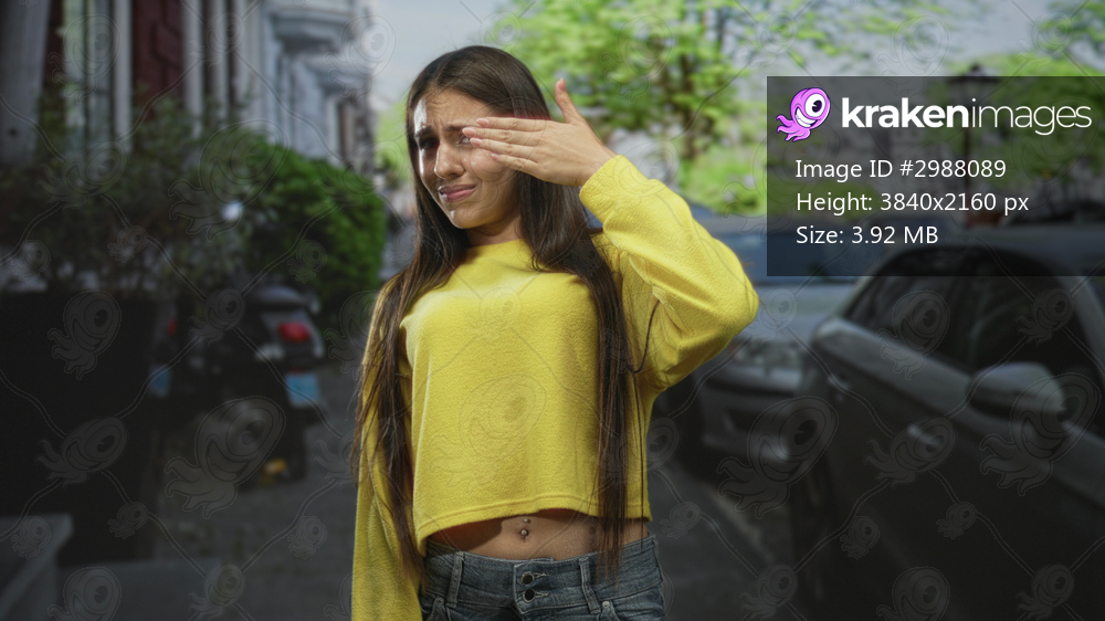 Young woman covering eyes with hand on street with parked cars, cropped yellow sweater revealing navel piercing and denim jeans; shyness privacy.