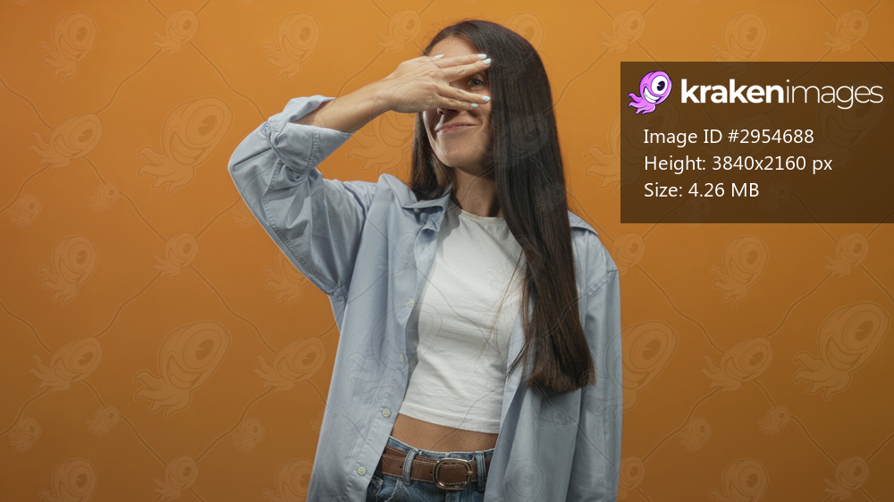 Young woman covering eyes with hand, smiling and laughing while wearing white crop top, light blue shirt and jeans in studio with orange backdrop; playful surprise. - Kraken Images