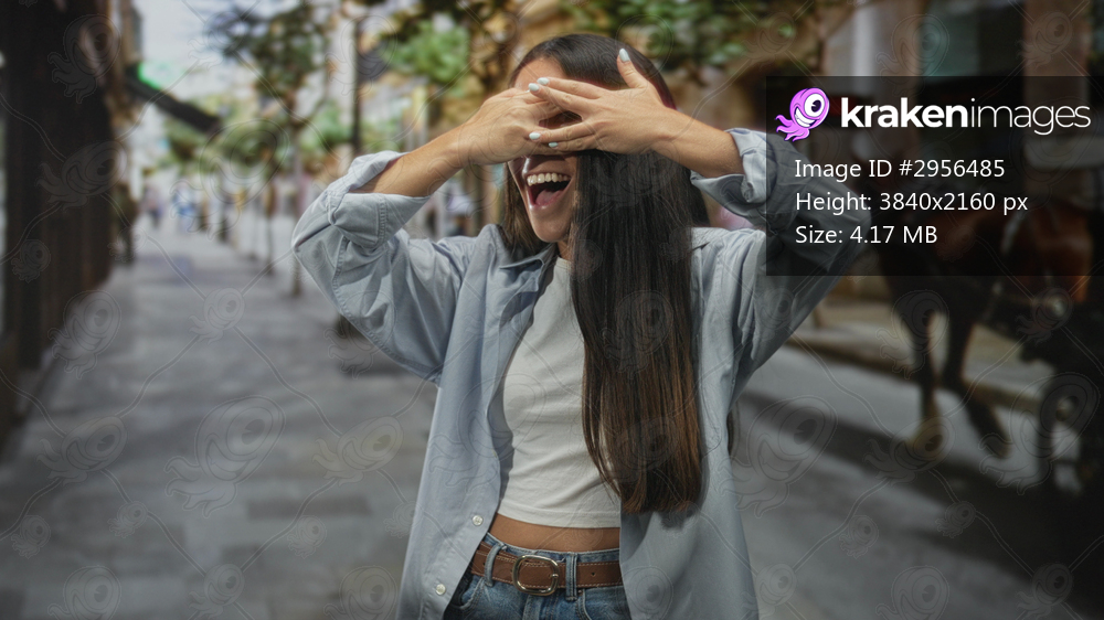 Young woman covering eyes with hand and smiling on a narrow street near a carriage; playful surprise.