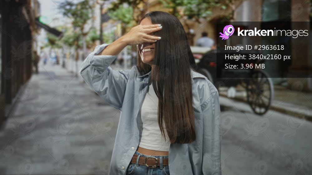 Young woman covering eyes with hand and smiling on a narrow street near a carriage; playful surprise.