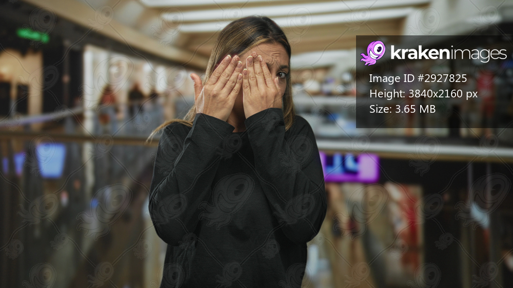 Young woman covering face with both hands while standing in a busy indoor shopping mall center near glass railing and storefronts; anxiety privacy shyness. - Kraken Images