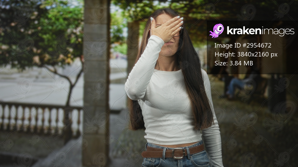 Young woman covering face with hand and adjusting glasses while standing under a building colonnade near a stone balustrade, wearing white long sleeve top and jeans; privacy annoyance. - Kraken Images