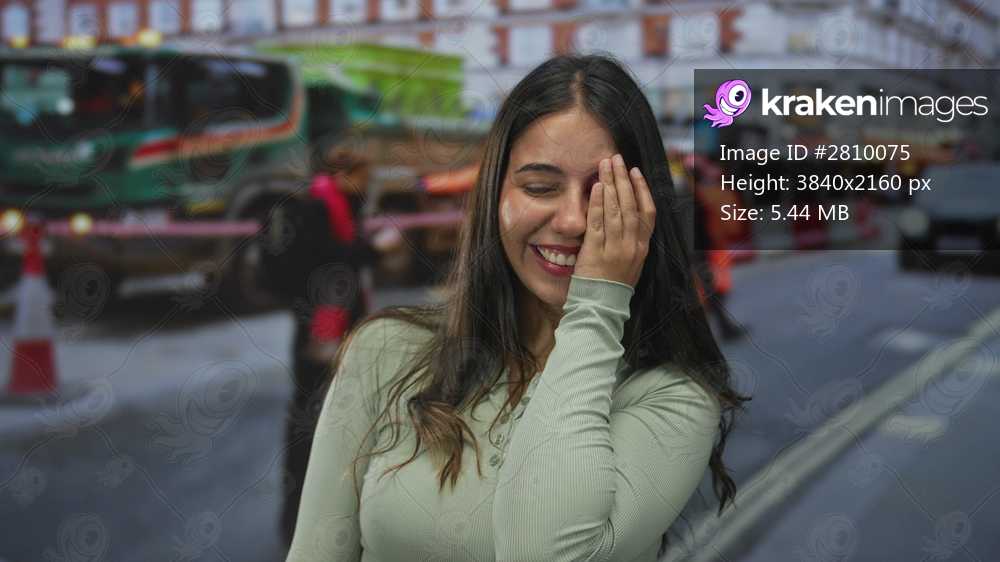 Young woman covering her eye with her hand on a city street in front of construction vehicles with traffic cones behind; shyness.