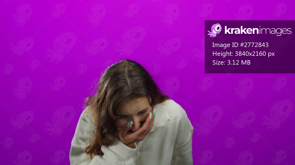 Young woman covering her mouth appears amused or surprised against an isolated pink background wall, with a casual white sweatshirt and playful expression highlighting emotion. - Kraken Images