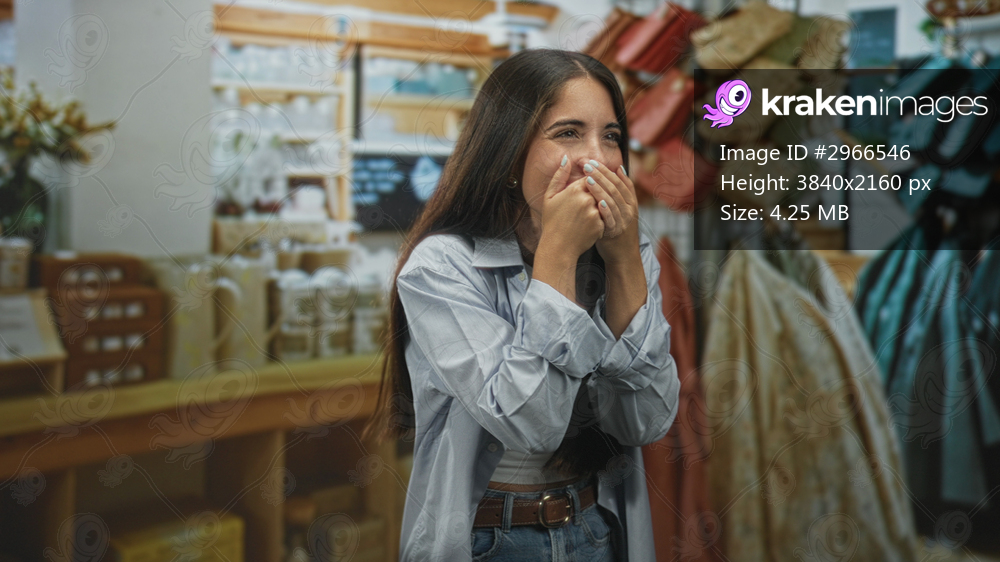Young woman covering mouth with both hands in a retail boutique building, wearing jeans and open shirt while laughing in surprise; joy surprise delight. - Kraken Images