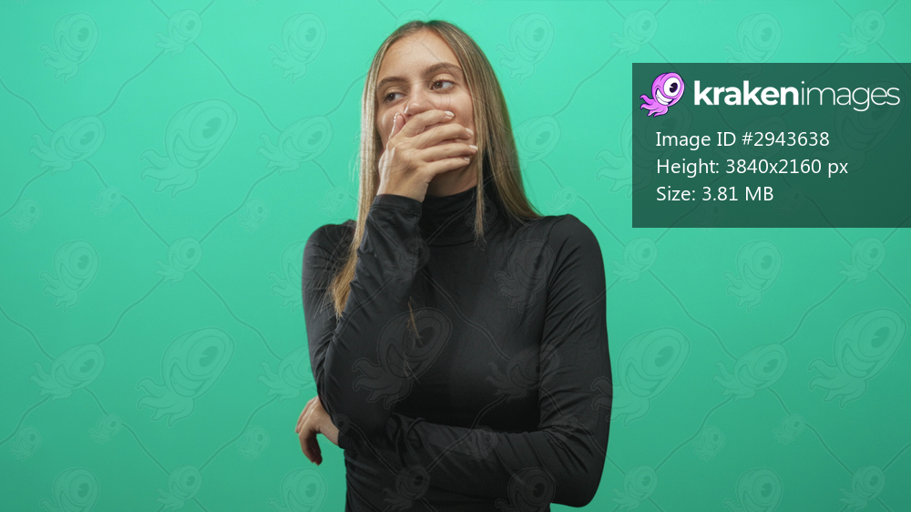 Young woman covering mouth with hand and crossed arms in green studio wearing black turtleneck under soft lighting; surprise.