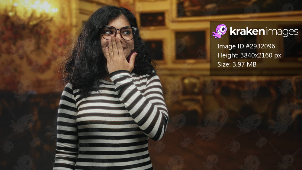 Young woman covering mouth with hand in building gallery with framed paintings and antique chairs; surprise curiosity.