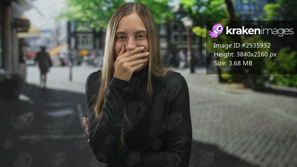 Young woman covering mouth with hand on sunlit cobblestone street, wearing black turtleneck and crossed arms; shy amusement.