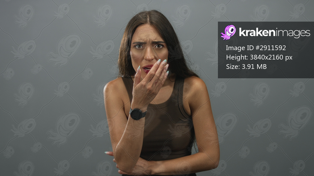 Young woman covering mouth with hand and visible fingernails wearing tank top and smartwatch in gray studio; surprise anxiety.