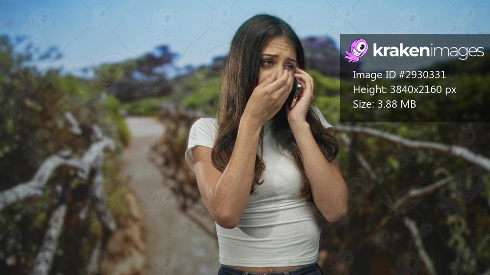 Young woman covering mouth with hand while holding smartphone and wiping tears on a forest path by green bushes; anxiety emergency help.