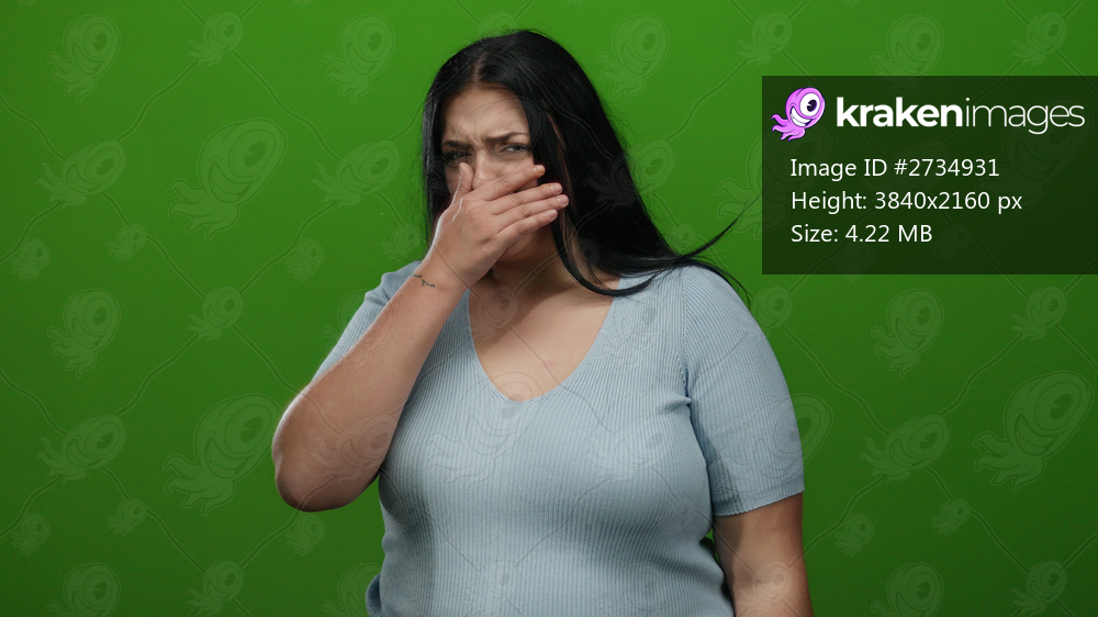 Young woman covering mouth on green background, expressing surprise or embarrassment, dressed in blue shirt, isolated and looking concerned, suitable for emotional themes. - Kraken Images