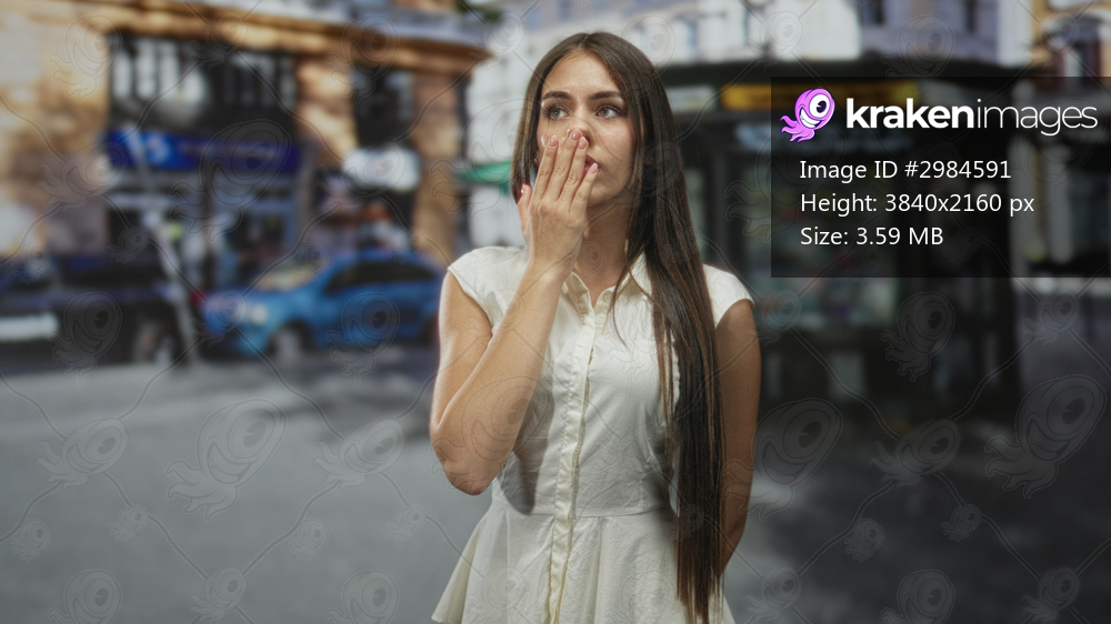 Young woman covers her mouth with hand on a crowded street, white dress and braces visible in a candid closeup; surprise discovery.