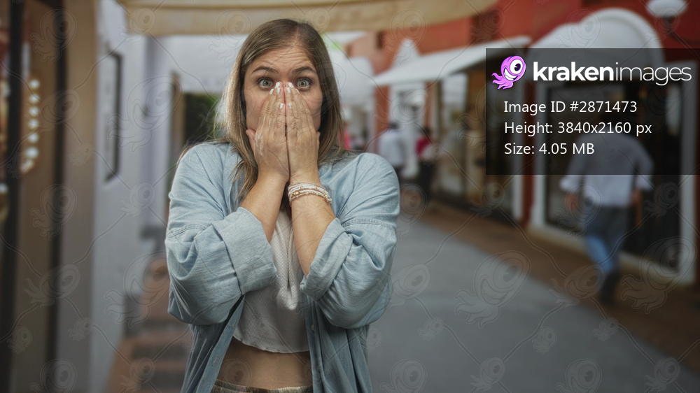 Young woman covers mouth with hands in busy urban sunlit street shopping district in afternoon; shock.