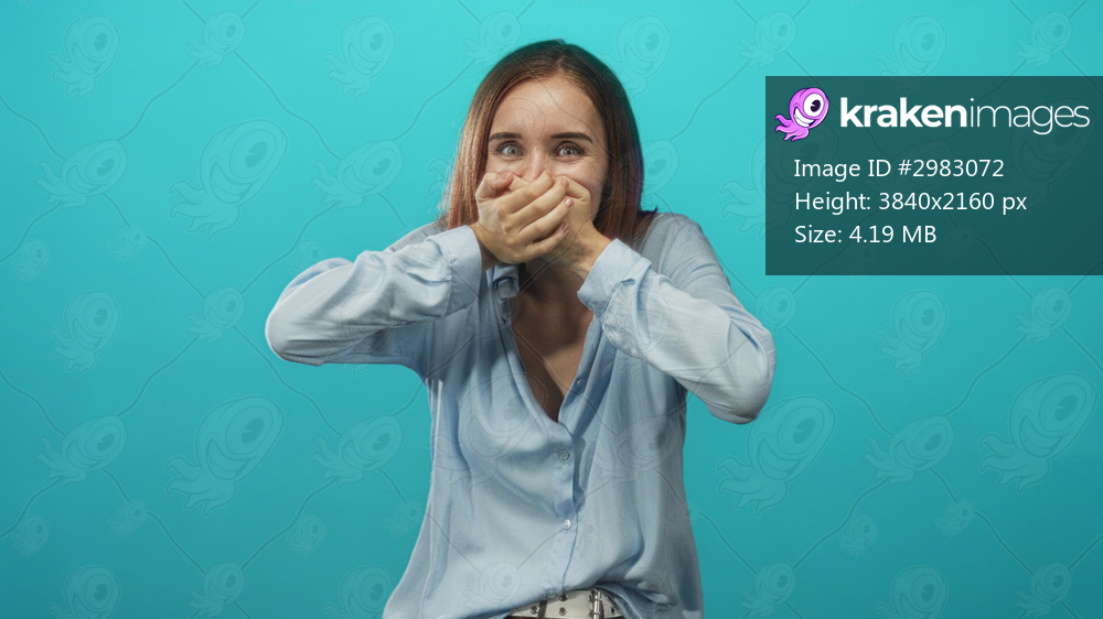 Young woman covers mouth with hands wearing light blue shirt and belt, eyes wide, leaning forward in studio; surprise secrecy.