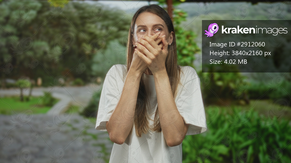 Young woman covers mouth with hands while smiling on a green park path near trees and grass; shyness.