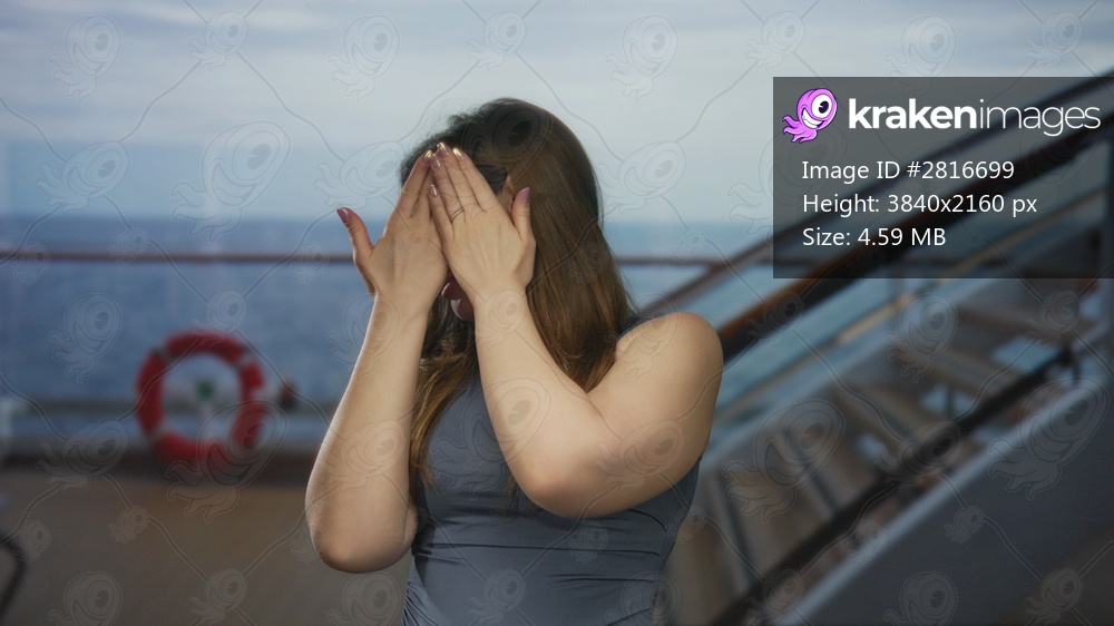 Young woman covers mouth with trembling hands and clings to railing on building; fear vulnerability.