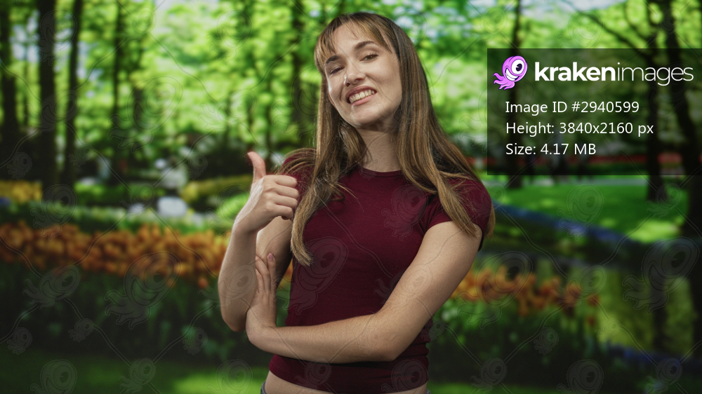 Young woman with crossed arms and a thumbs up gesture in a forest park with tulip beds and a pond; confidence ease.