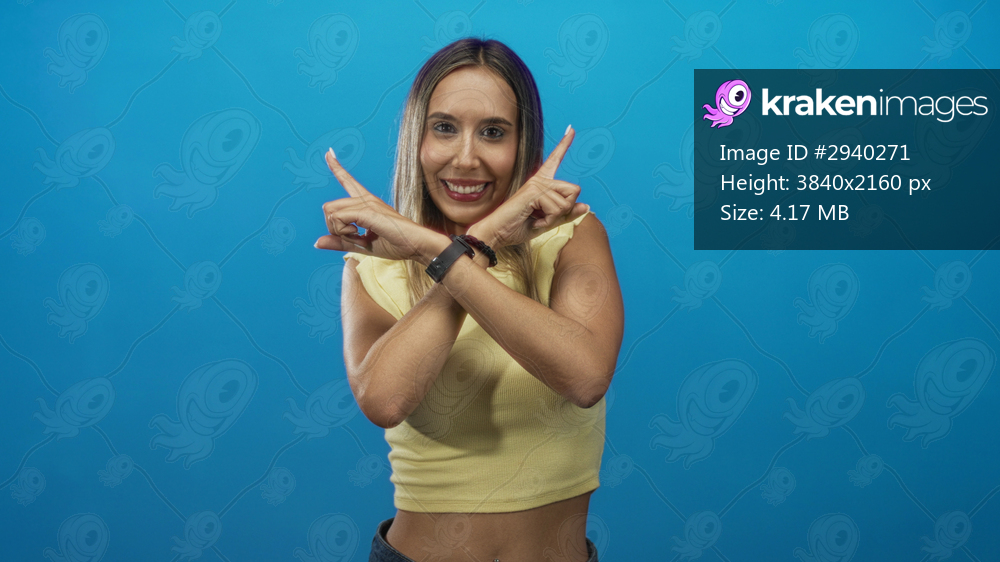 Young woman with crossed arms pointing fingers, bare midriff visible, refusal gesture in blue studio; playful.