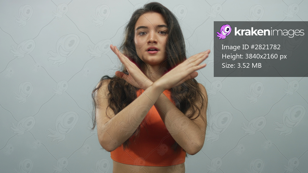 Young woman crosses bare arms in denial gesture in studio under soft lighting with stern expression; rejection.