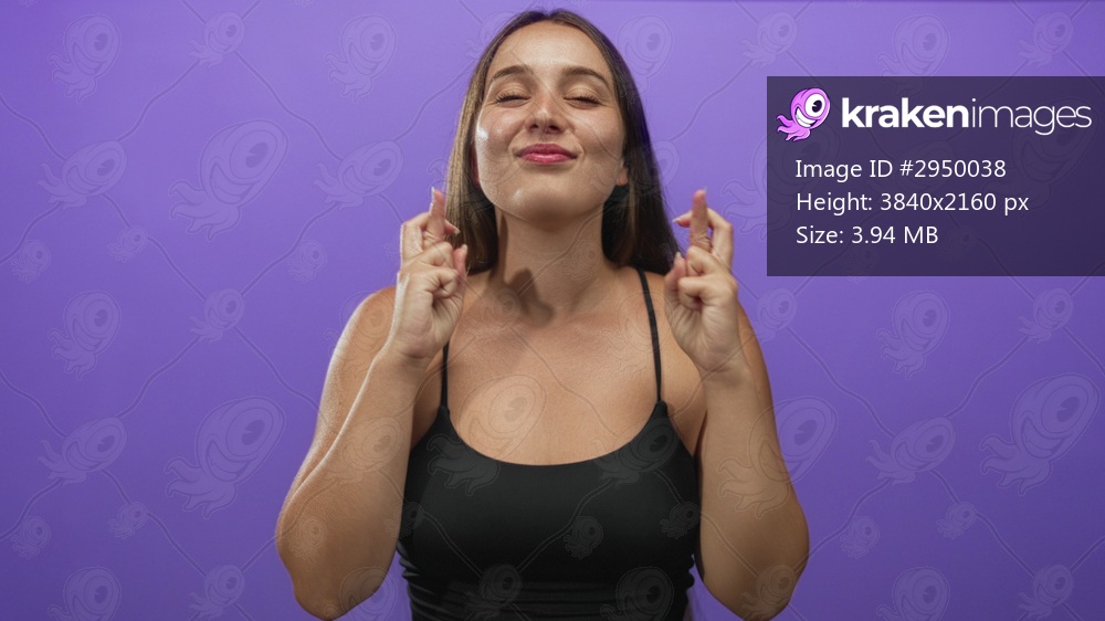 Young woman crossing fingers and smiling, hands raised in purple studio wearing black tank top; hopeful wish.