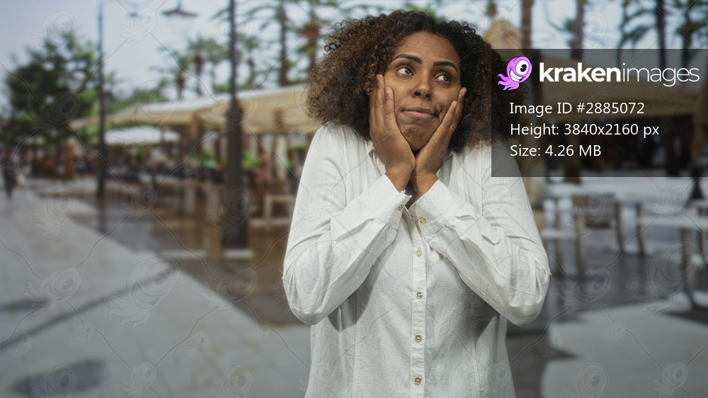 Young woman cupping cheeks with both hands in a street terrace restaurant near palm trees and outdoor tables; exasperation.