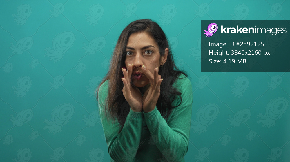 Young woman cupping hands to mouth shouting toward camera in teal studio wearing green sweater; urgency alert.