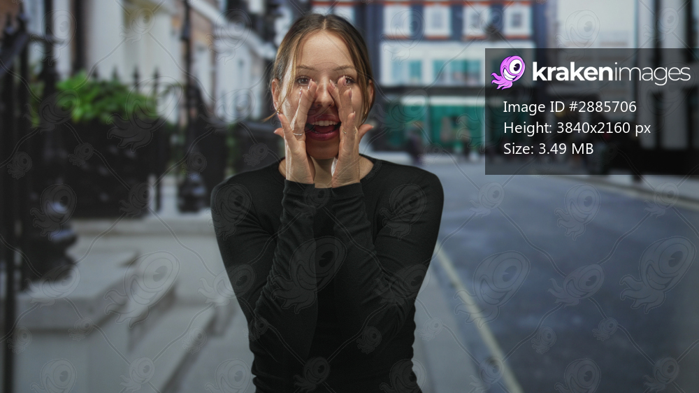 Young woman cupping hands to mouth while shouting on a street by building steps and iron fence; joy announcement.