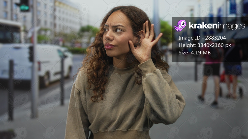 Young woman cupping her ear with hand on a busy city street beside buses and shops listening for a sound or voice; curiosity.