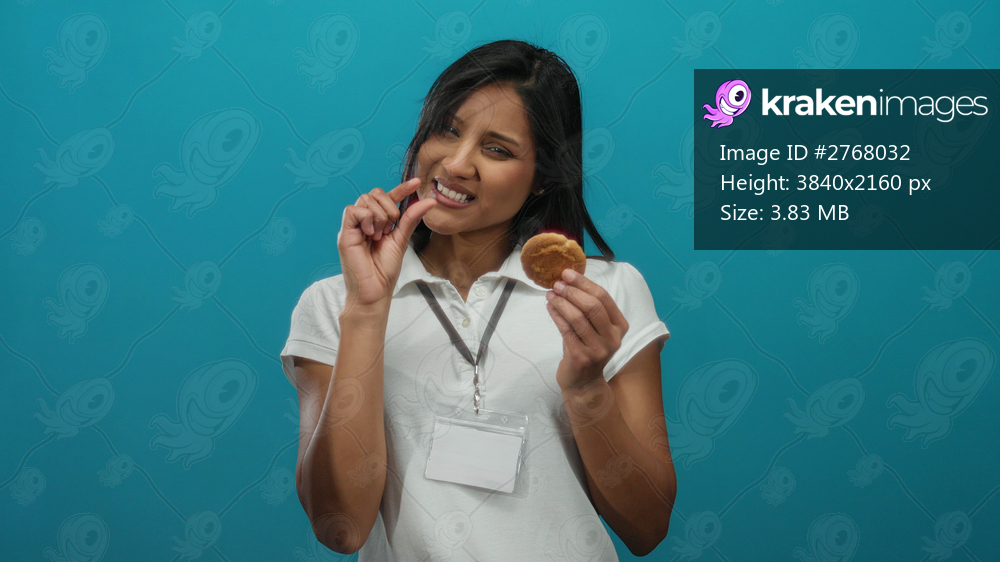 Young woman with curious expression holds small cookie against blue background, wearing white shirt and name badge, suggesting something tiny with fingers. - Kraken Images