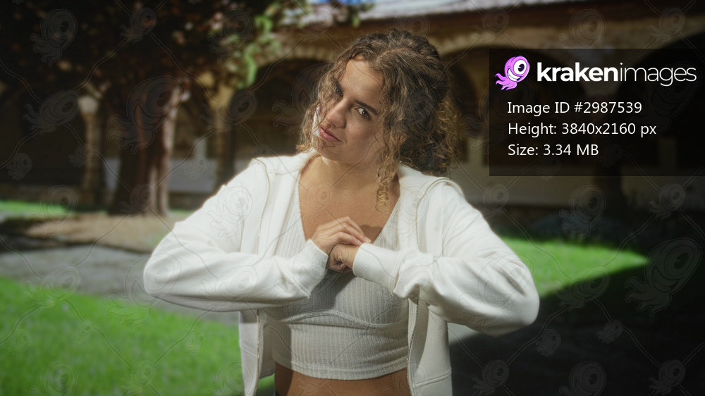 Young woman with curly hair clasping hands at chest, mild smile and tilted head, wearing white hoodie and cropped top, standing in a building courtyard; confidence. - Kraken Images