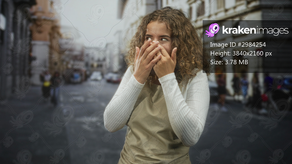 Young woman with curly hair covers mouth with hands, laughing in an urban street with historic buildings; joy playfulness.