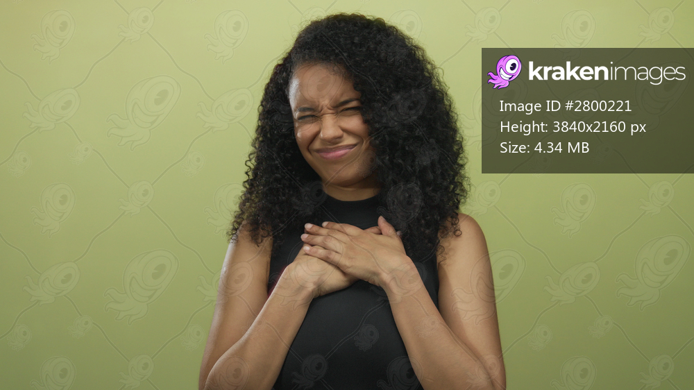 Young woman with curly hair expressing gratitude over an isolated yellow background.