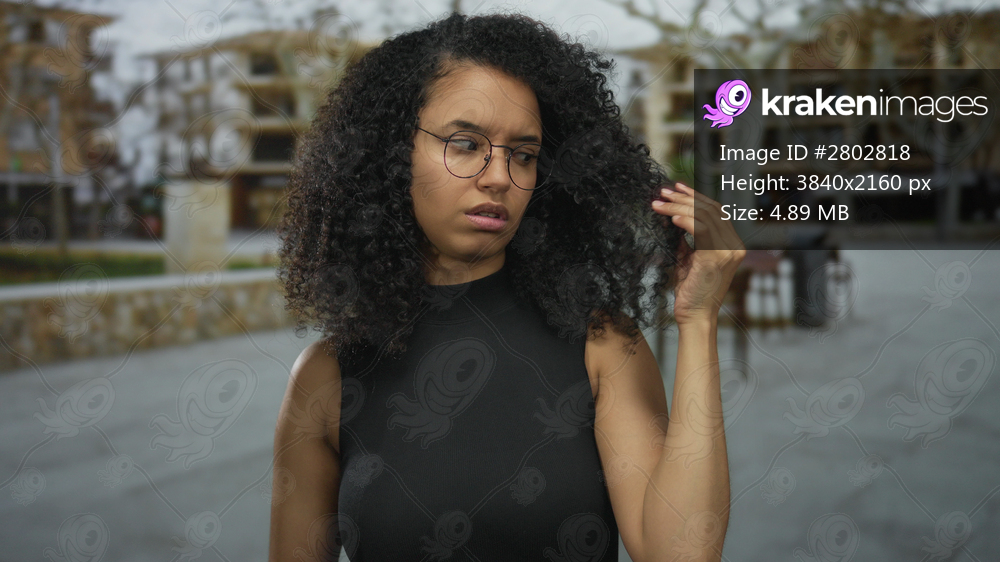 Young woman with curly hair and glasses on a street showing different facial expressions in an outdoor urban area, emphasizing emotion and diversity.