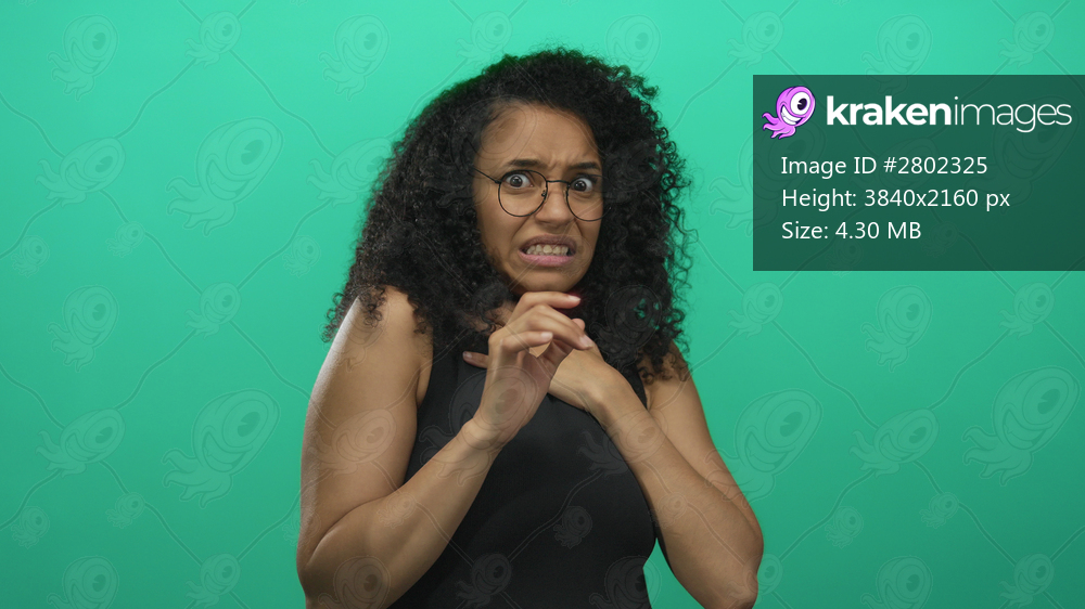 Young woman with curly hair and glasses wearing a black sleeveless top grasps her throat in studio; fear.