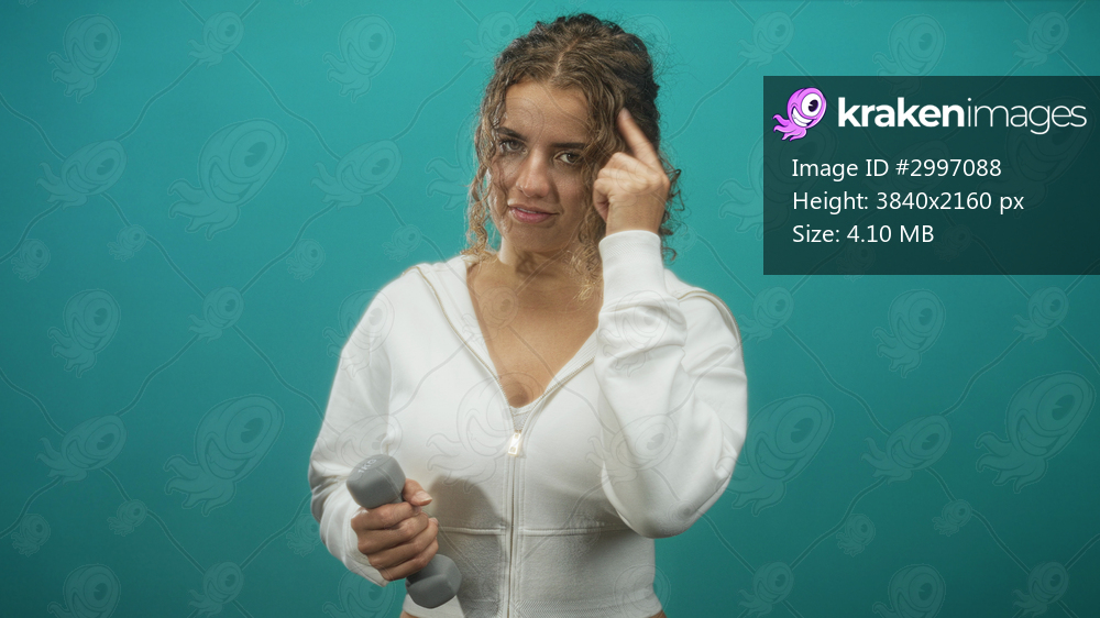 Young woman with curly hair holding a dumbbell and points finger at camera in studio wearing white zip hoodie, workout pose and direct gaze; confidence motivation fitness. - Kraken Images