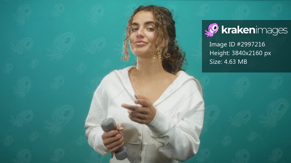 Young woman with curly hair holding a dumbbell and points finger at camera in studio wearing white zip hoodie, workout pose and direct gaze; confidence motivation fitness. - Kraken Images