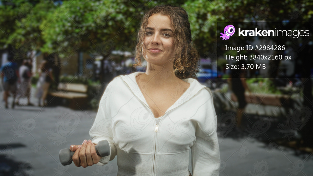 Young woman with curly hair holding a dumbbell and smiling in a white zip hoodie on a tree lined street; confidence wellness.