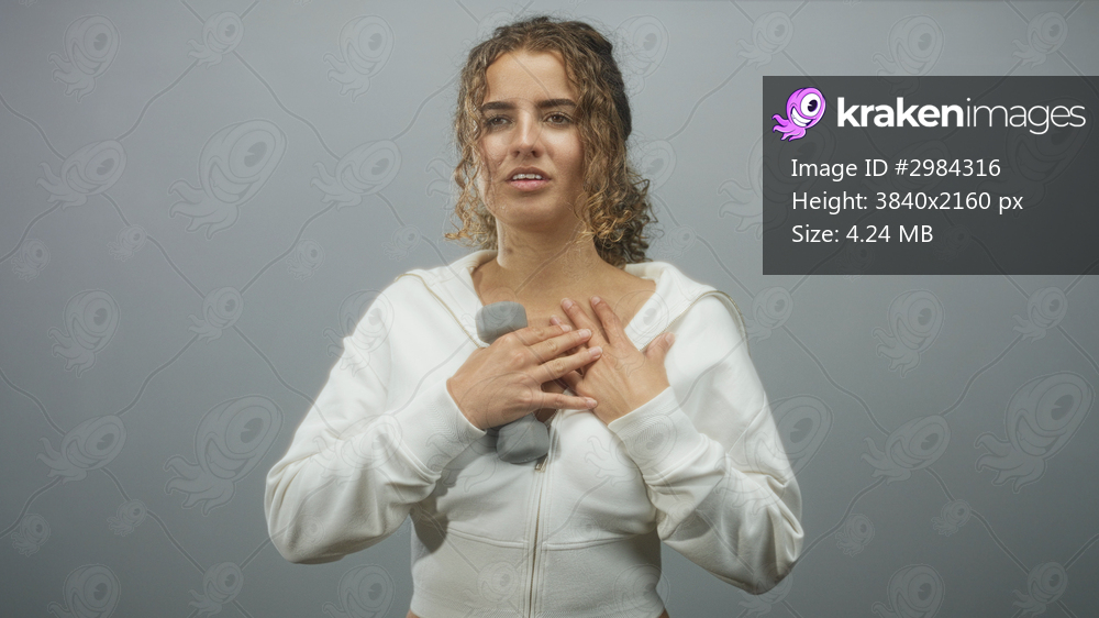Young woman with curly hair holding a light dumbbell to her chest with both hands and closed eyes in a studio; relief.