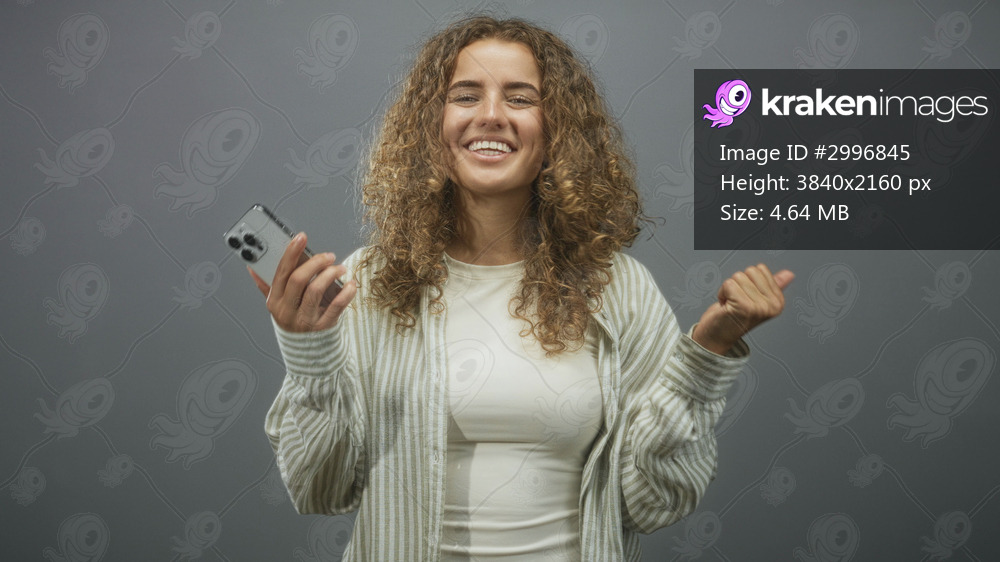 Young woman with curly hair holding a smartphone and fist pumping while smiling and celebrating a message or call in a studio setting; joy success.